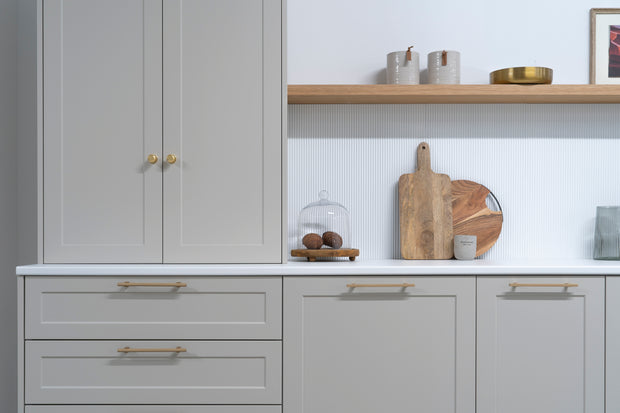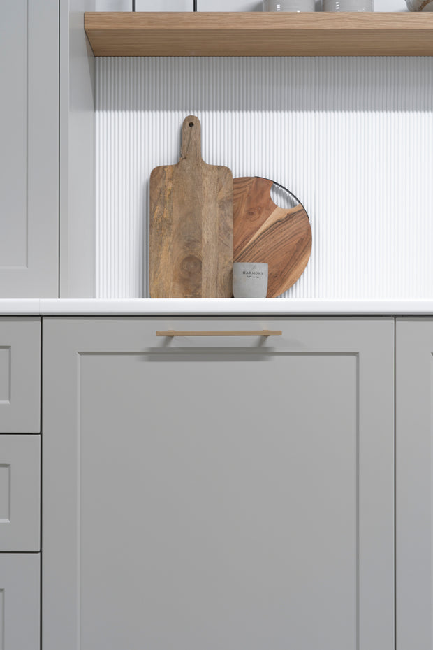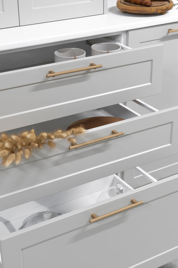 Für ein einheitliches Erscheinungsbild empfehlen wir, die gesamte Bestellung auf einmal aufzugeben, da jede Charge von einem anderen Baumstamm stammt. Die Fronten bestehen aus einer 18 mm Trägerplatte, beidseitig mit 0,8 mm Furnier belegt, was eine Gesamtdicke von 19 mm ergibt.