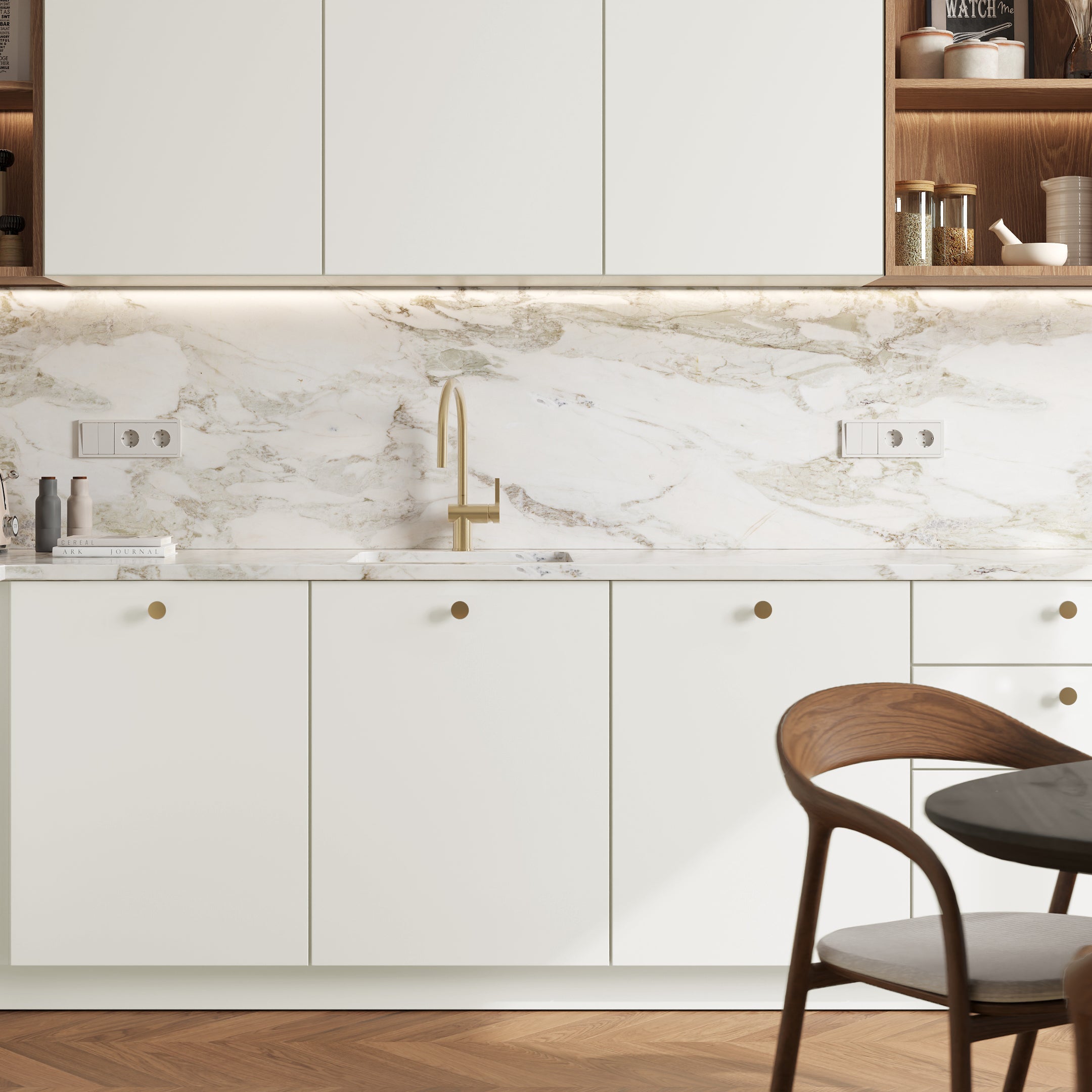 • Weiße matte Küchenfronten in IKEA Metod Stil mit goldfarbenen Griffen und Marmorarbeitsplatte. - NovaFronten - Küchen Fronten Konfigurator - Standard - Matt