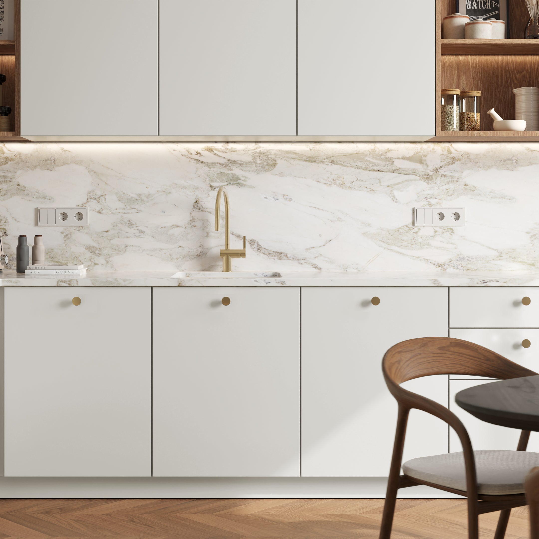 • Moderne weiße IKEA Metod Küchenfronten in matt mit goldfarbenen Griffen vor Marmorarbeitsplatte. - NovaFronten - Küchen Fronten Konfigurator - Standard - Matt