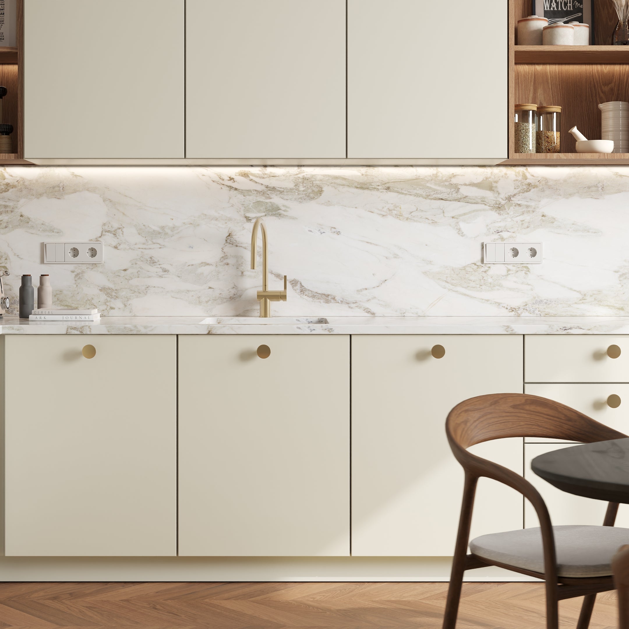 • Matt sandfarbene IKEA Metod Küchenfronten mit goldfarbenen Griffen und Marmorarbeitsplatte. - NovaFronten - Küchen Fronten Konfigurator - Standard - Matt