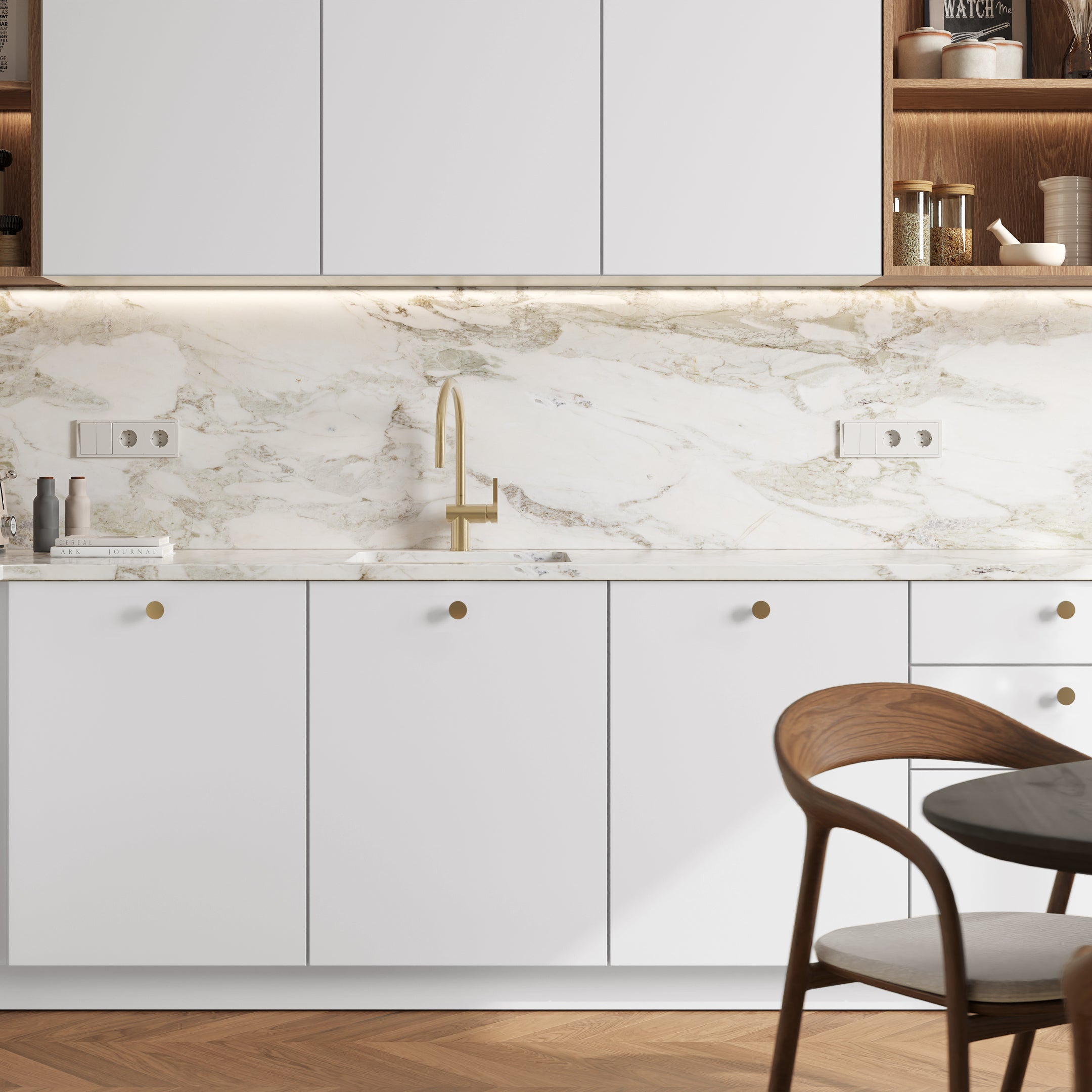 • Mattweiße IKEA Metod Küchenfronten mit goldenen Griffen und Marmorarbeitsplatte. - NovaFronten - Küchen Fronten Konfigurator - Standard - Matt