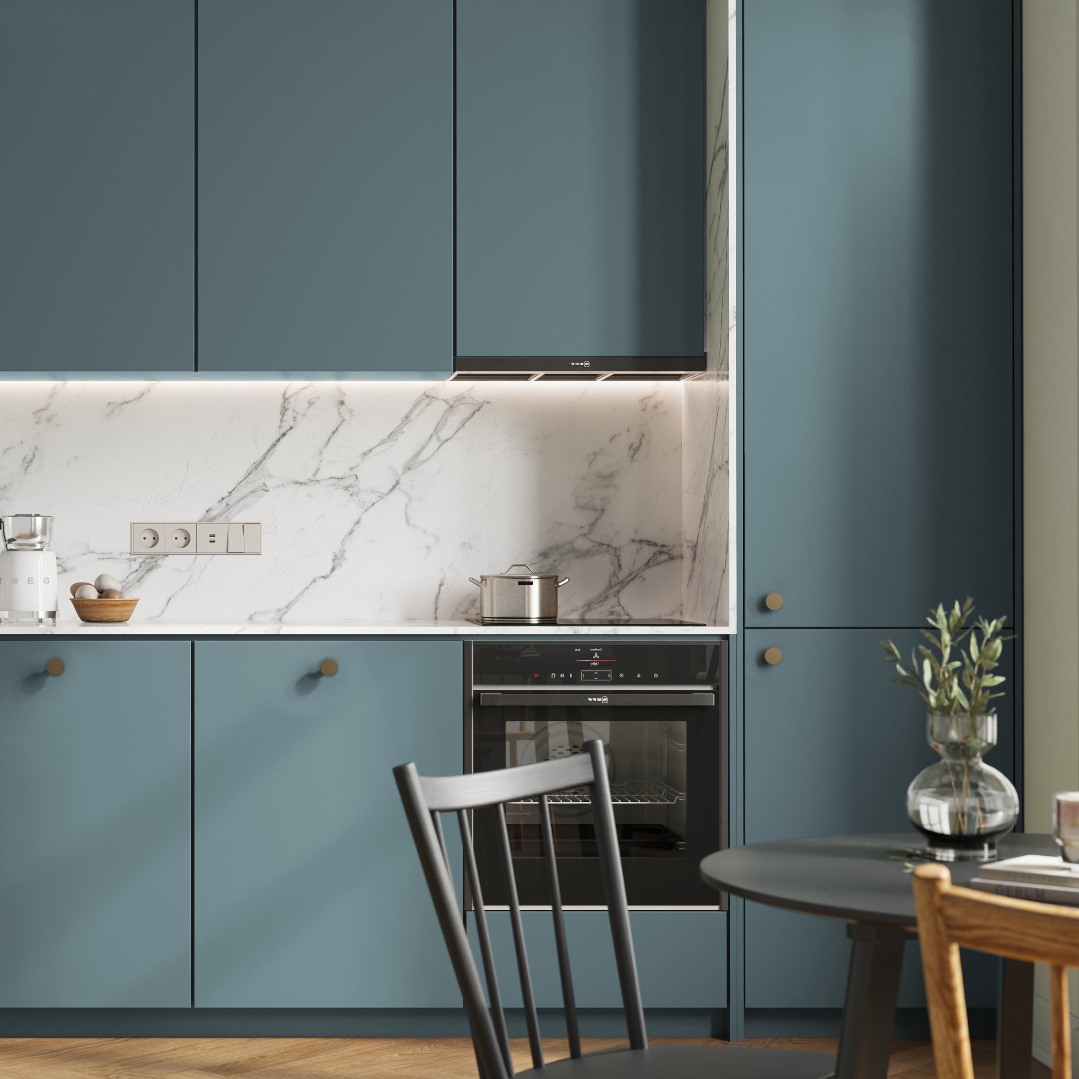 • IKEA Metod Küchenfronten in mattem Blau/Grau mit Goldknöpfen und Marmorarbeitsplatte. - NovaFronten - Küchen Fronten Konfigurator - Standard - Matt